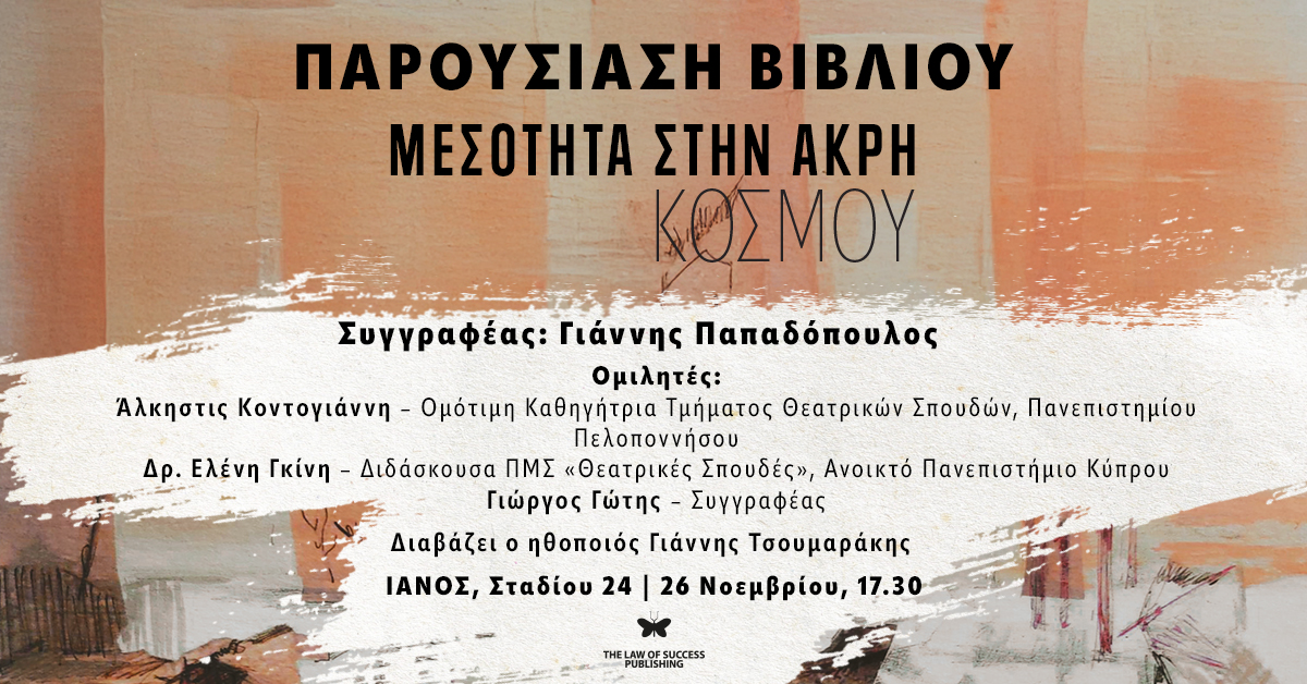 Ο Γιάννης Παπαδόπουλος θα μας παρουσιάσει το φιλοσοφικό μυθιστόρημα «Μεσότητα στην άκρη του κόσμου», ένα έργο μοναδικό, το οποίο κινείται στα όρια μεταξύ αφήγησης και στοχασμού, χωρίς να παύει ποτέ να αναζητά την καθαρτική μεσότητα που προκαλεί κοινωνική σύγκλιση και εμπνέει πολιτισμική επανεκκίνηση.