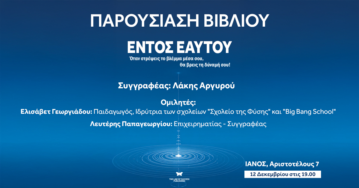 Ο Λάκης Αργυρού θα μας παρουσιάσει το βιβλίο «Εντός Εαυτού», ένα έργο αφιερωμένο στην αναζήτηση της προσωπικής ισορροπίας και της εσωτερικής επίγνωσης. Στο βιβλίο αυτό, ο συγγραφέας μάς καθοδηγεί σε μια πορεία 22 βημάτων, μέσα από την οποία αναδεικνύονται η σημασία της αυτογνωσίας, της συναισθηματικής ωριμότητας και της ουσιαστικής σχέσης με τον εαυτό.